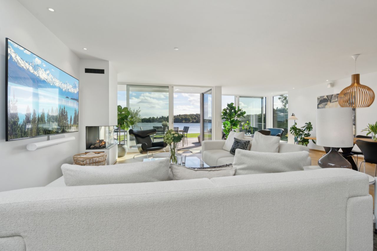 I stueplanet møder man også to værelser, hvoraf det største byder på et fantastisk syn mod solopgange over vandet, og glaspartierne er skydedøre til terrassen. Dette værelse har adgang til et walk-in-closet, og endelig skal man se gæstetoilettet og det markante badeværelse. Et baderum er placeret i kælderen, hvor man desuden kan se frem til en vinkælder og fire disponible rum. Etagen fremtræder i boligkvalitet, som tilsvarer resten af villaen.