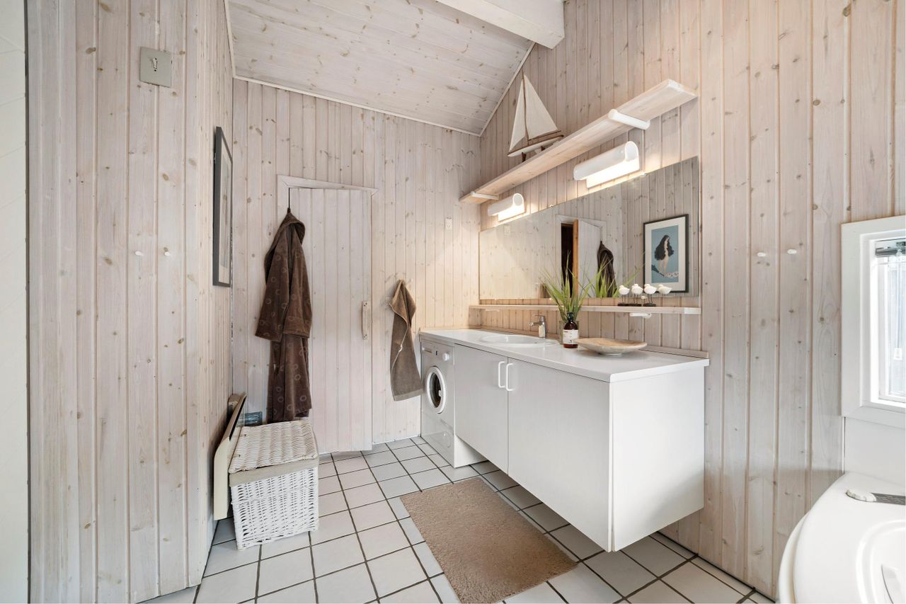 at her er to badeværelser, hvoraf det ene indeholder både sauna og spabad. Det højloftede opholdsrum