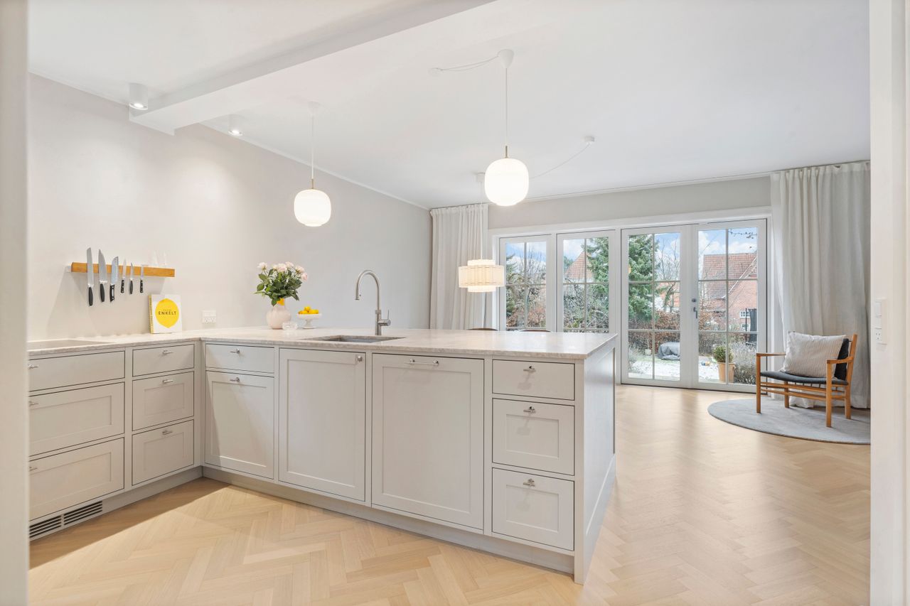 Stueplan byder på et stilfuldt snedkerkøkken med bordplade i natursten og integrerede hårde hvidevarer. Køkkenet er åbent og indbydende med god plads til både madlavning og samvær. De store havedøre skaber en naturlig forlængelse af opholdsrummene og giver direkte adgang til haven samt et smukt og generøst lysindfald.
