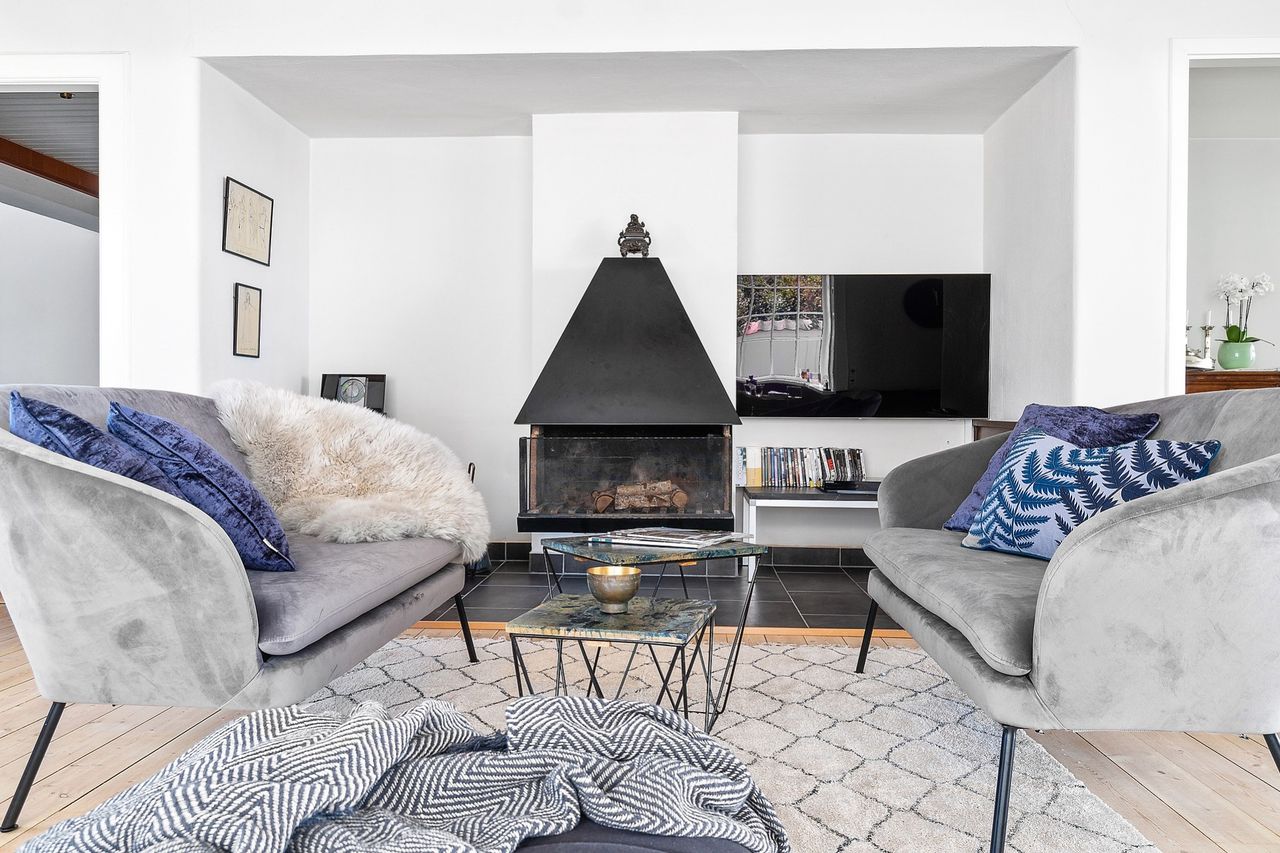 1. salen rummer stor pejsestue , som meget nemt kan bygges om til ekstra værelse. Fra stuen udgang til