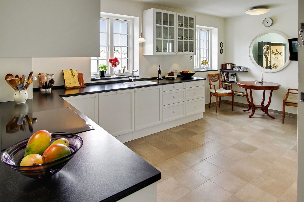 Endvidere spisestue med gulvklinker i forbindelse med flot nyere Hanstholm-køkken med spiseplads og