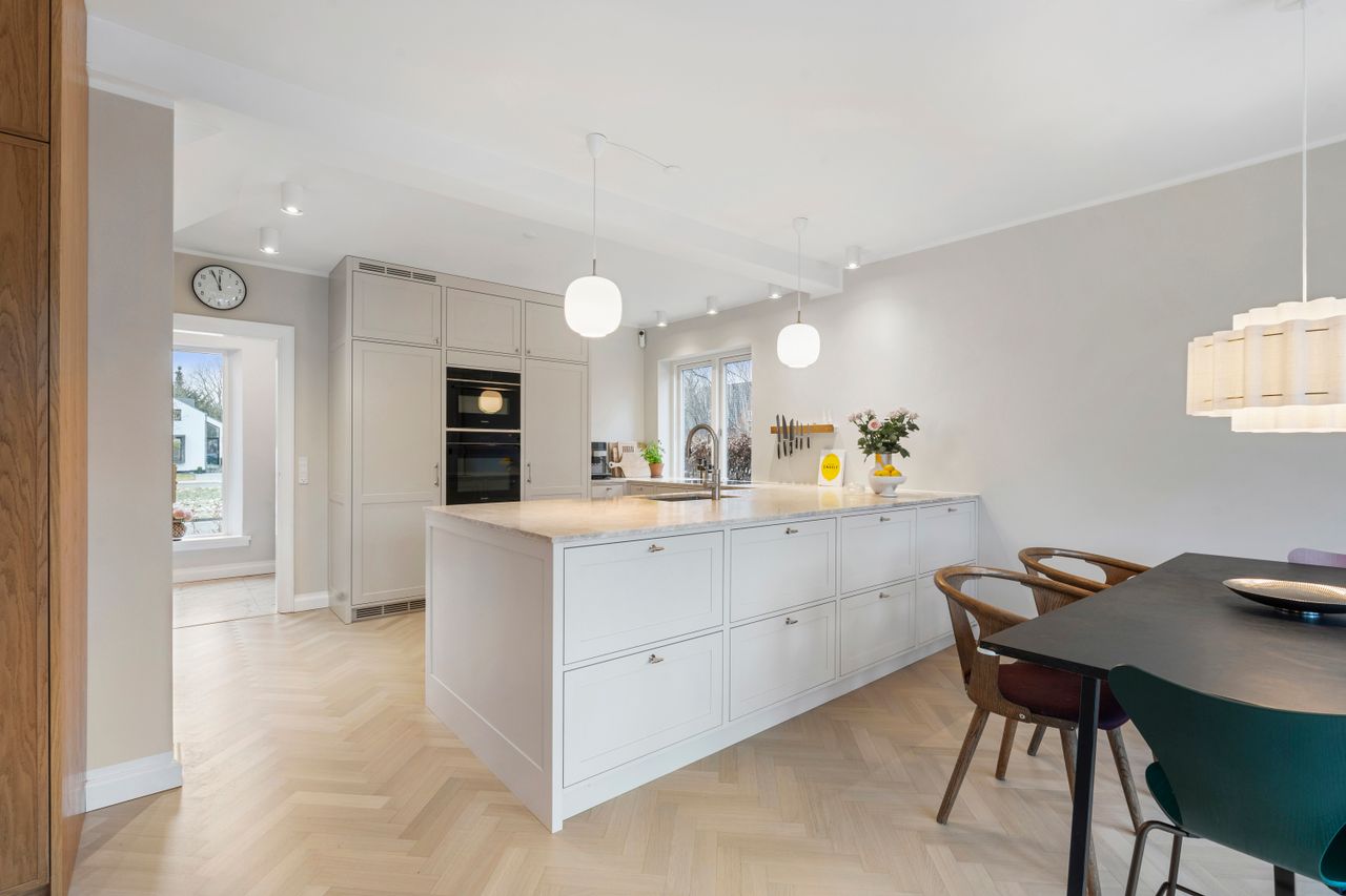 Stueplan byder på et stilfuldt snedkerkøkken med bordplade i natursten og integrerede hårde hvidevarer. Køkkenet er åbent og indbydende med god plads til både madlavning og samvær. De store havedøre skaber en naturlig forlængelse af opholdsrummene og giver direkte adgang til haven samt et smukt og generøst lysindfald.