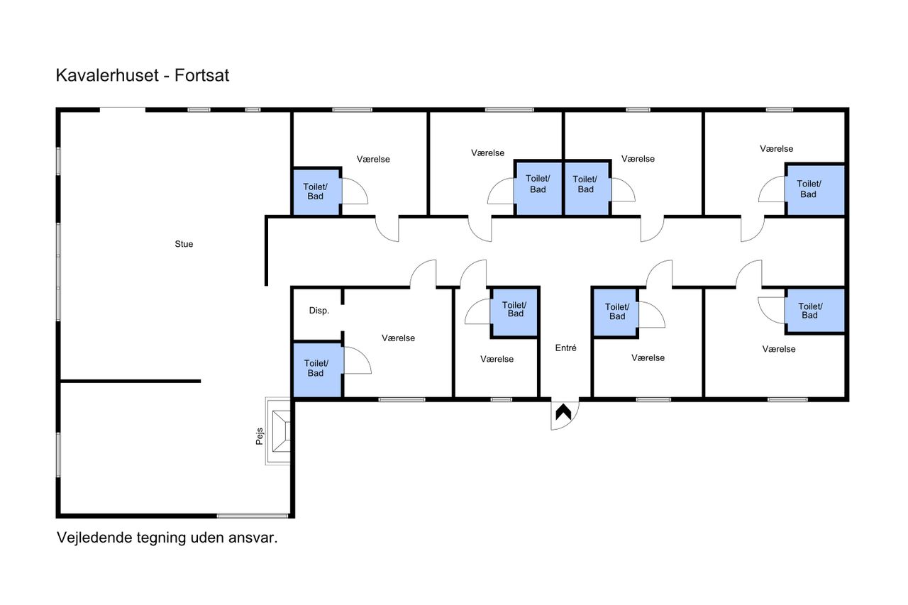 tilstødende bygninger rummer 43 soveværelser, 24 badeværelser, 30 toiletter, en række hyggelige
