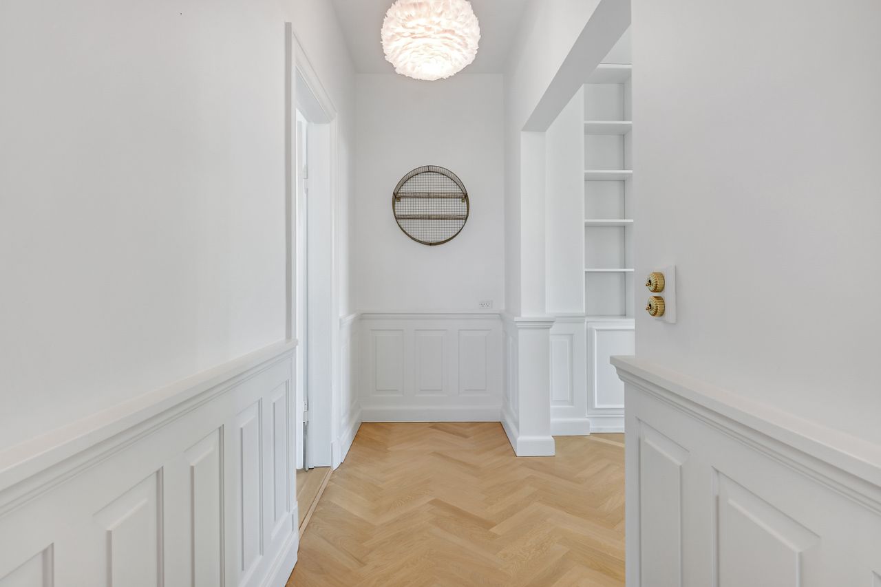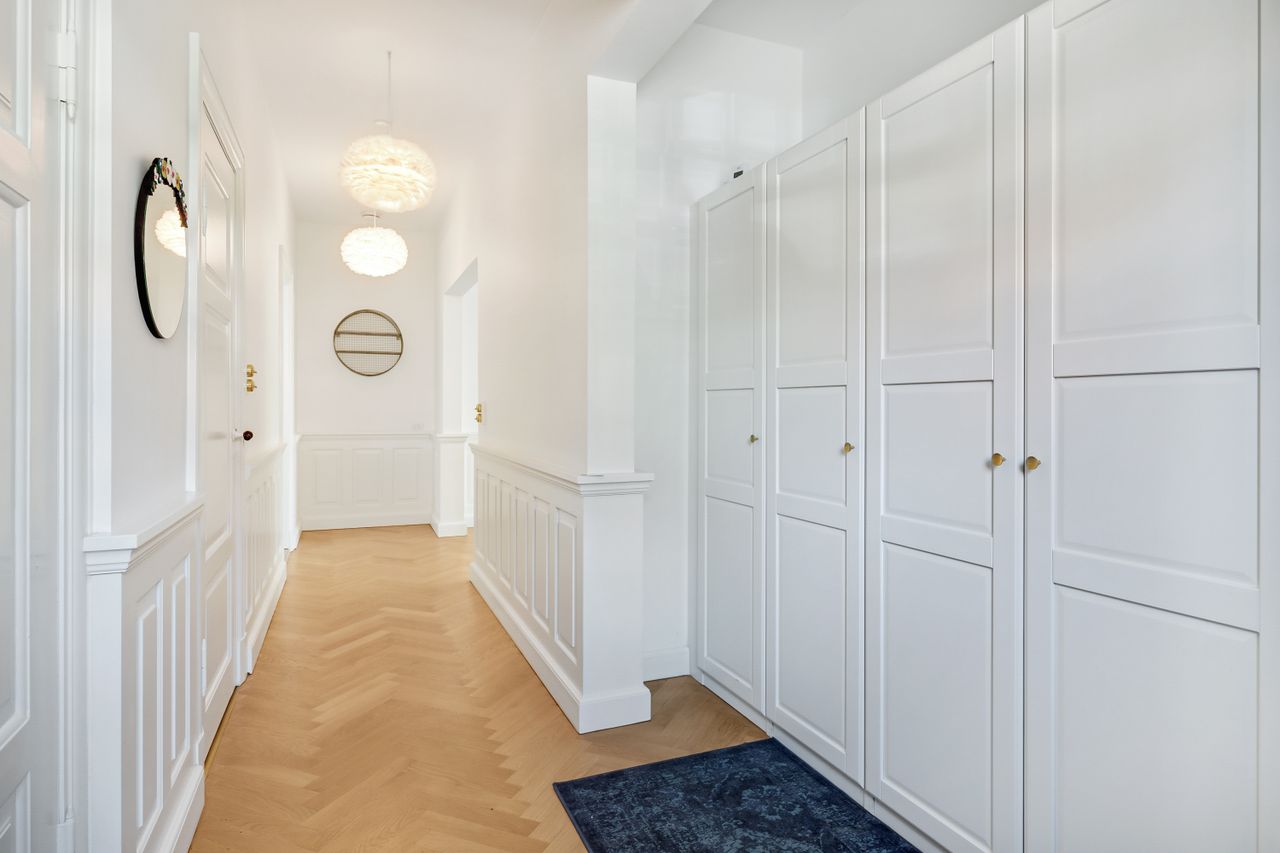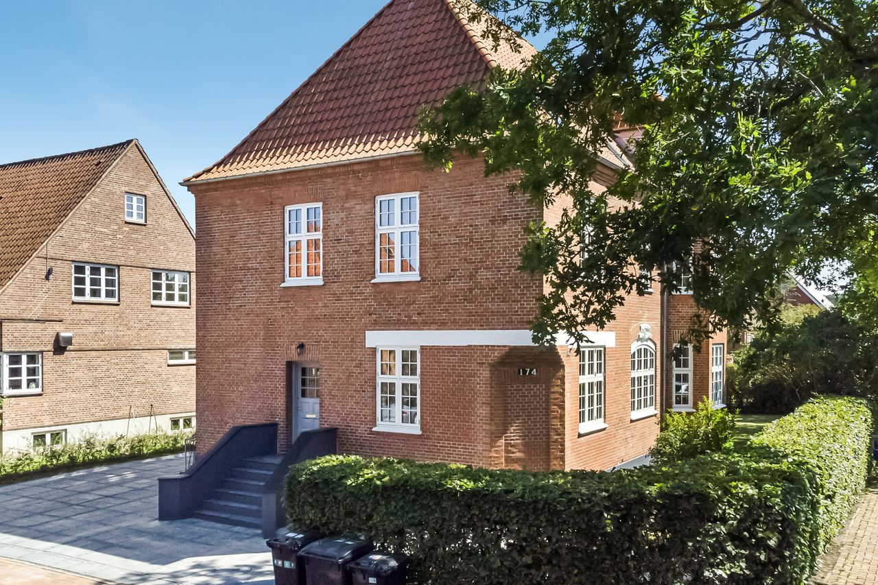 Velkommen til en markant pragtvilla, der fremstår med pondus her i Hunderupkvarteret blandt andre skønne ejendomme. I får masser af plads på tre plan, hvor især stueplan fremstår herskabelig og med alle de arkitektoniske detaljer, som man kan ønske sig. Her er der tre flotte opholdsrum, som ligger en suite med smukke gulve i sildebensmønster og mageløst flot stukkatørarbejde i stuerne. Her er også vægpaneler og indbyggede reoler, som er med til at skabe en stemning, der er både varm og eksklusiv. De skønne rum fremstår overvejende lyse og imødekommende, og derudover er der tilført vovede stilelementer på især badeværelserne og ved trappeforløbet, hvor I vil opleve en spændende eksplosion af farver og mønstre, som spiller godt op til den ellers gennemgående lyse, skandinaviske stil.