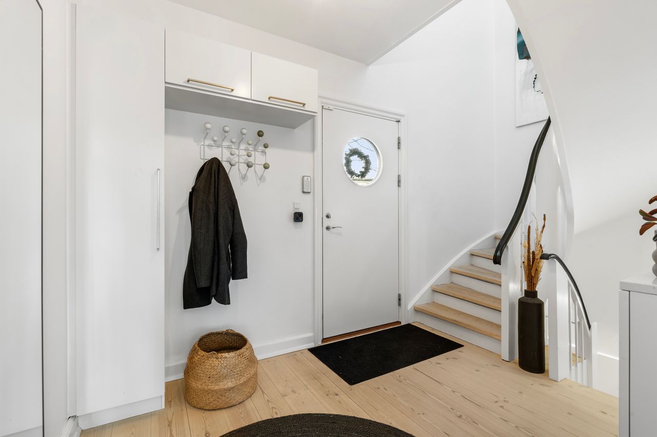 På første sal er der tre store værelser og et dejligt rummeligt badeværelse. Til det ene af værelserne er der både en integreret garderobe og altan, mens der til et andet af værelserne er skabsvæg og altan. Og til det tredje værelse er der skabsvæg. I stueplan får I endnu et værelse, der er af lidt mindre størrelse end værelserne ovenpå. Det ligger lige ved entréen, hoveddøren og etagens badeværelse, hvilket gør det til et oplagt hjemmekontor eller gæsteværelse.