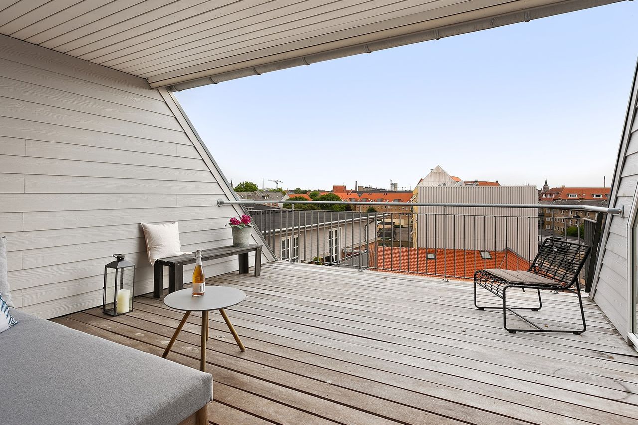 som det er p.t.. Endvidere toilet. Fra stue adgang til stor tagterrasse med udsigt over byens tage og med