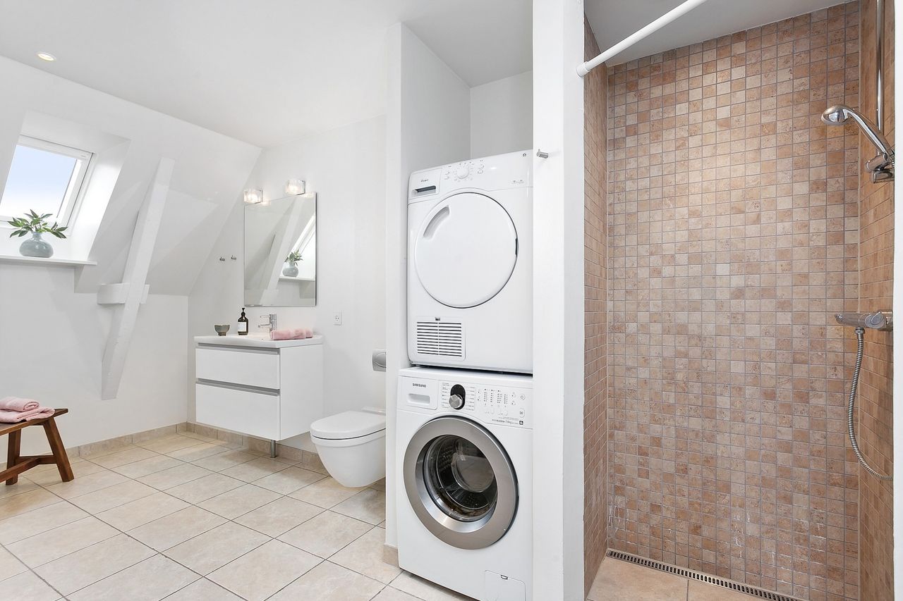 soveværelse med skabsvæg, dejligt stort badeværelse med gulvvarme og brus samt vaskesøjle.